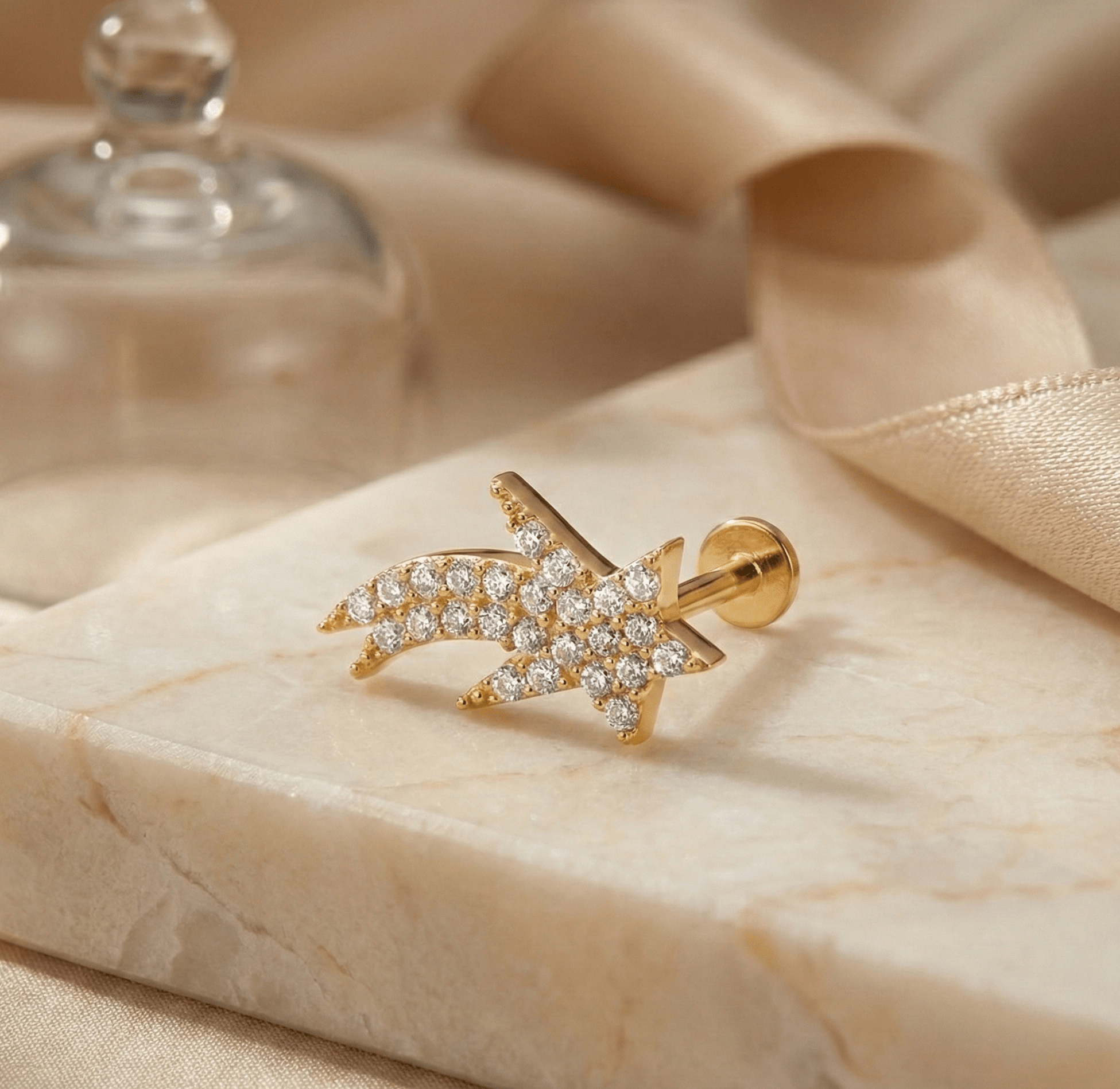 Den stjärninspirerade formen gör smycket perfekt för dig som gillar celestial smycken eller vill lägga till en unik detalj i din piercingstil. Kombinationen av formen och de glittrande stenarna skapar en balanserad mix av lekfullhet och lyx.